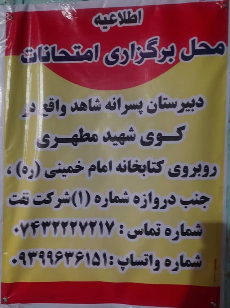 قابل توجه دانشجویان و اساتید گرامی ، برای شرکت در امتحانات نیم سال دوم 1401-1402 مرکز علمی کاربردی گچساران2 به آدرس زیر مراجعه بفرمایید: دبیرستان