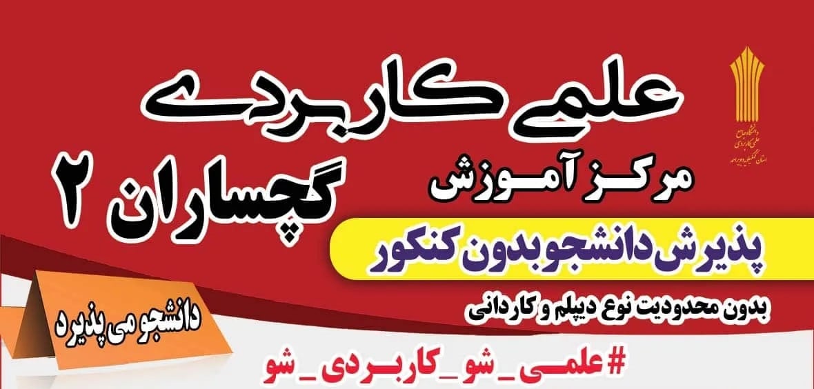 پذیرش دانشجو بدون نیاز به کنکور در مقاطع کاردانی و کارشناسی توسط مرکز علمی کاربردی گچساران2 آغاز شد. شما میتوانید از تاریخ 28 خرداد ماه